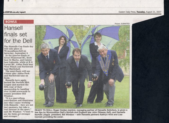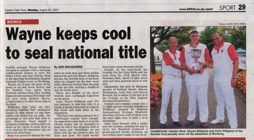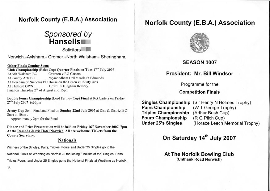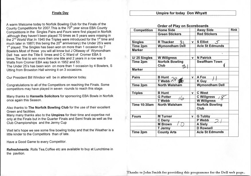 Today Bob Thacker became the Norfolk Singles Champion. This Norfolk EBA Singles Championship win is significant to Wymondham Dell as the very first Norfolk Singles Championship was won by Charles Revell of the Dell in 1937 (70 years ago).